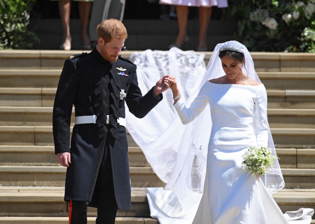 Disaksikan oleh jutaan mata serata dunia, Meghan Markle tiba di Gereja St. George, Istana Windsor dalam dress adi busana polos rekaan Clare Waight Keller, pengarah kreatif wanita pertama Givenchy, memeluk susuk tubuh Duchess of Sussex itu dengan sempurna. Dipadankan dengan vel berukuran lima meter rekaan Givenchy juga, tiara Order of Splendor yang dipinjamkan oleh Ratu Elizabeth, dan juga sepasang anting-anting berlian Cartier untuk menyempurnakan look raja seharinya (well in her case it is every day).