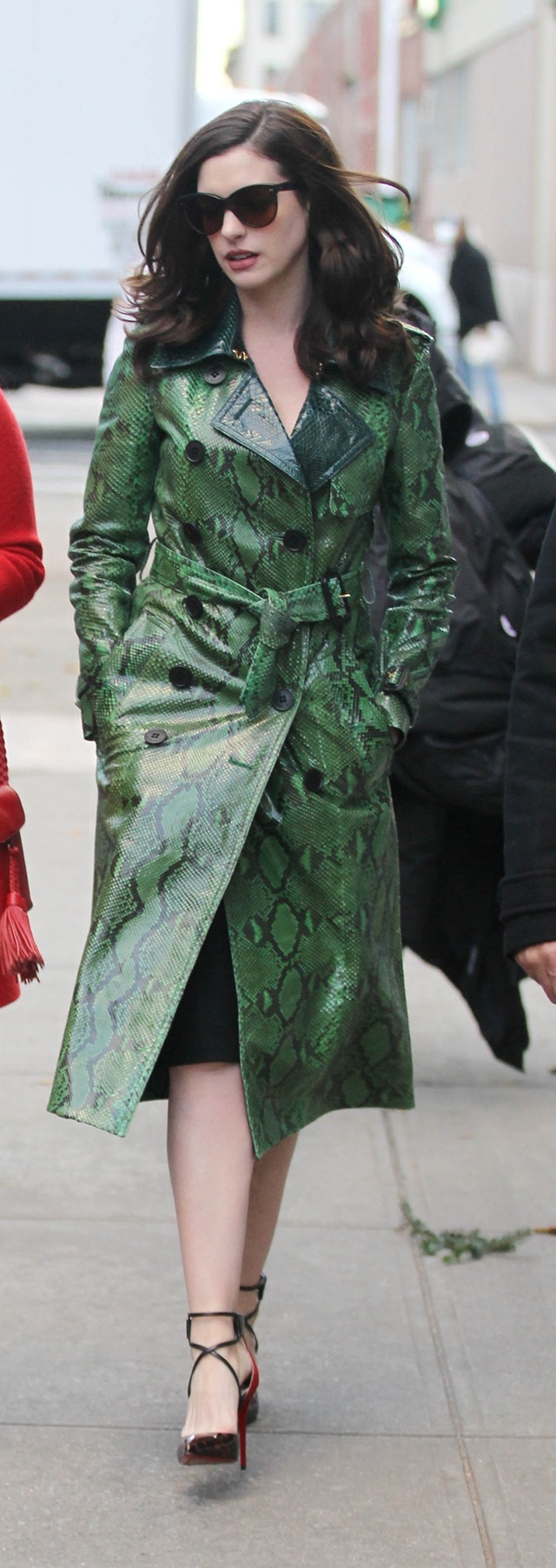 Anne Hathaway paling menarik perhatian dengan kot hijau kulit ularnya.
