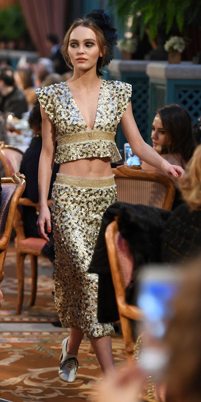 Lily-Rose berjalan dengan penuh keyakinan untuk pertunjukan tersebut dan dia mengenakan dua pasang busana Chanel. Busana pertama merupakan crop top peplum, skirt panjang yang dihiasi dengan manik-manik emas dan kasut tumit tinggi Oxford.