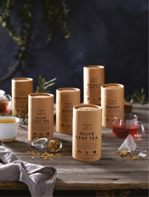 Jenama ini mengguna pakai kaedah tradisional Jepun dalam penghasilan teh hijau untuk memproses teh daun zaitun Stone & Grove. Daun zaitun dipetik segar dari ladang di Australia langsung terus distim dan dikeringkan sebagai daun teh. Keseluruhan proses ini hanya mengambil masa 4 hingga 6 jam selepas daun dipetik – menjamin kesegaran dan kualiti teh.