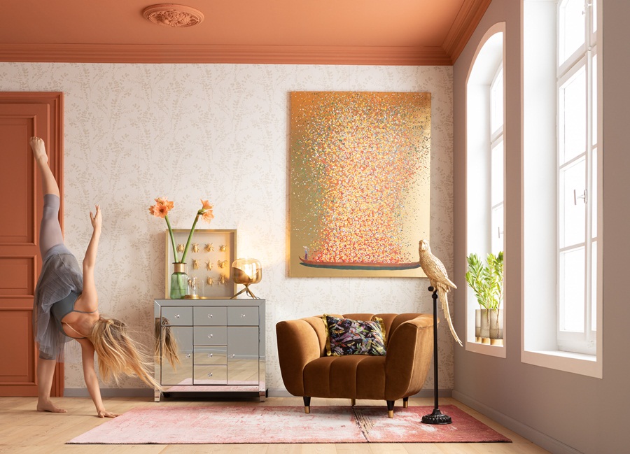 Rekaan rak menjadi ruang galeri di kediaman memperlihatkan aksesori dekor menarik refleksi kehidupan kosmopolitan dan eksentrik artisan Andy Warhol dan kumpulan Memphis. Pasu figura objek Gangster Rabbit rekaan pasangan artisan terkemuka, Gillie dan Marc. Hamparan permaidani bercorak abstrak dalam curahan warna trendy, dipadankan bersama kerusi berlengan swivel bersekali tempat rehat kaki. Kabinet berlaci dan meja konsol diperbuat dari kayu oak kekal klasik moden dalam teras reka bentuk seiring fungsi.