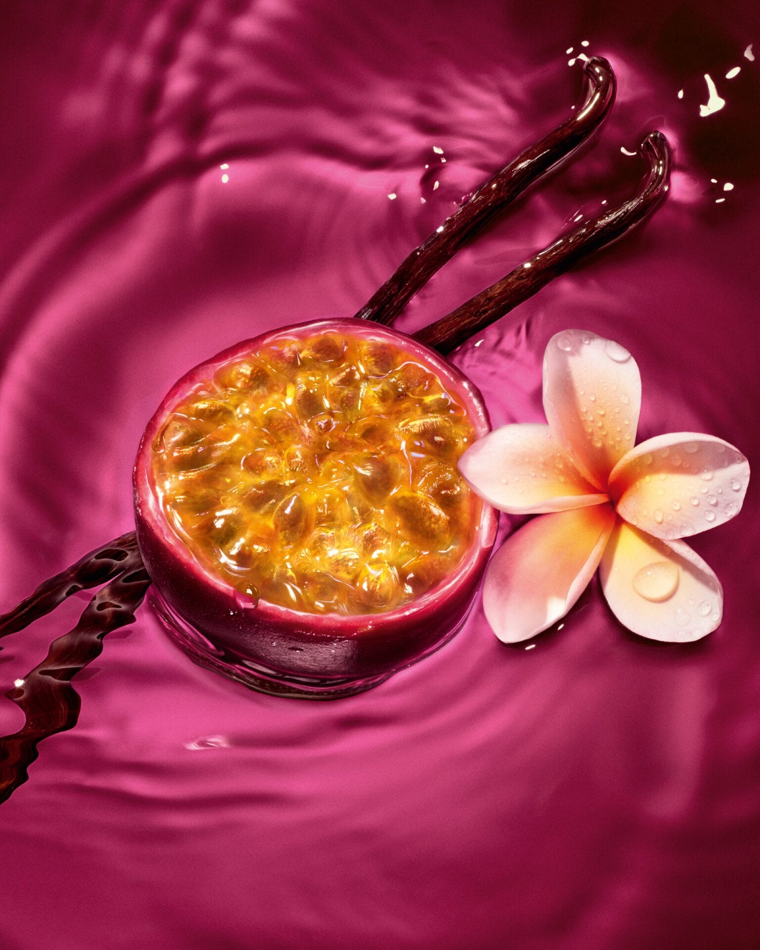 Dikemas dalam botol kaca segi empat panjang yang elegan dengan pinggir melengkung dan dibalut emas, wangian berwarna merah jambu ini mengandungi nota buah-buahan eksotik seperti passionfruit, frangipani, dan vanila yang mencipta simfoni aroma yang vibran dan luminous. Penutup emas dengan hiasan orb dan cincin bertindih memberikan sentuhan kemewahan yang sempurna.