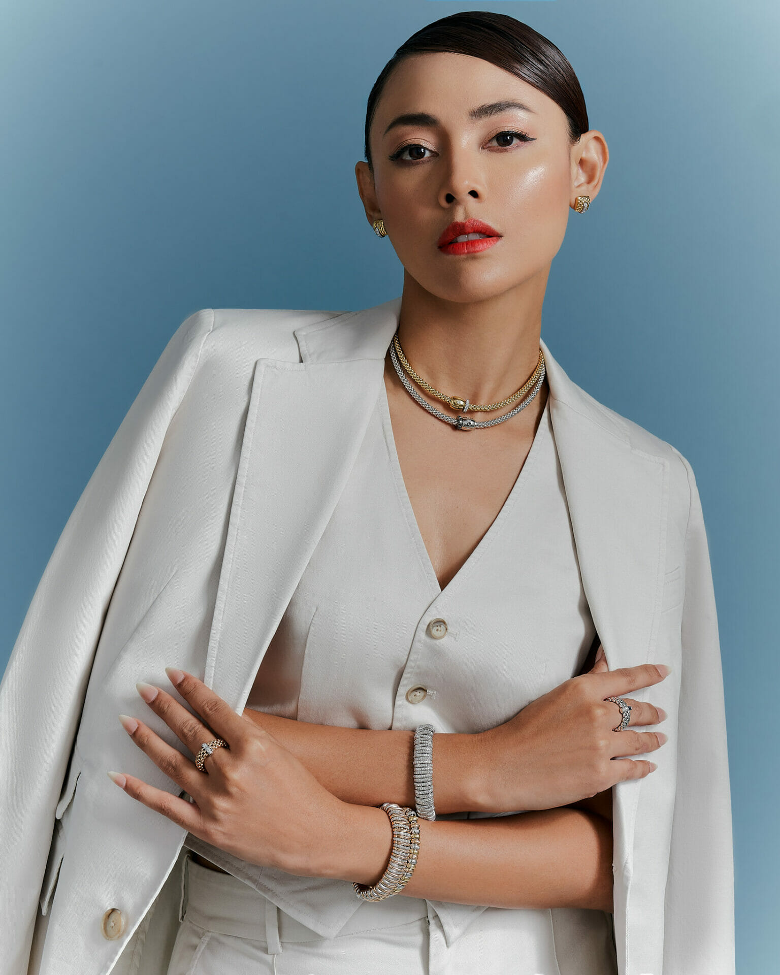 Mendekati gaya santai Whulandary, namun dia masih tampil ekstra setiap kali kami memandangnya. Itu simbol gaya peribadi wanita ini. Dia bijak padu-padan terutama sekali barang kemas. Begitu juga apabila dia menyarung busana formal ataupun ala edgy, setiap paduannya pasti tampil on point. Teknik layering adalah salah satu kunci dalam menggayakan barang kemas. Seperti di FOPE, setiap koleksinya berunsurkan desain kontemporari moden namun masih mampu tampil mewah memukau.