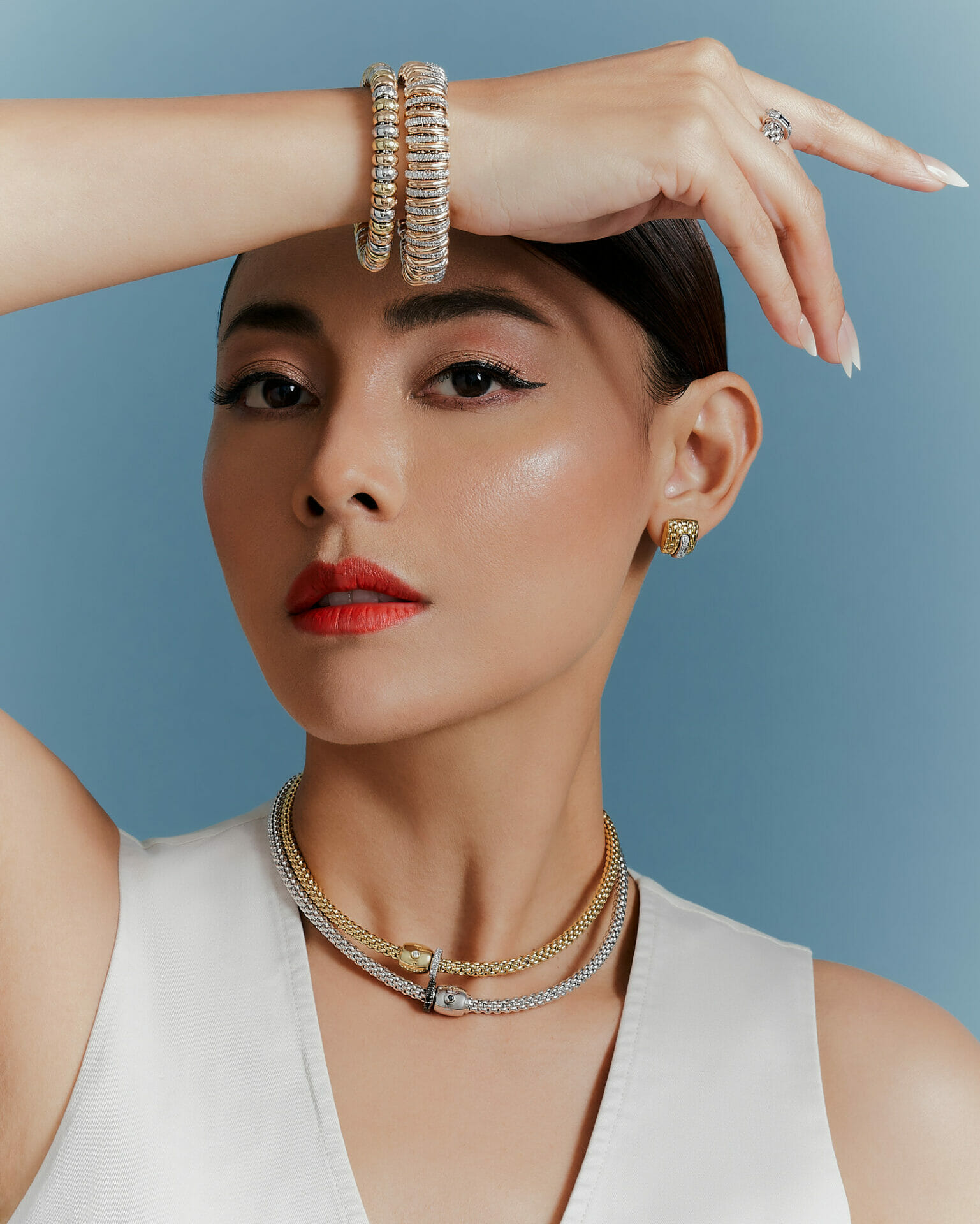 Whulandary menyarung The Solo Collection Flex’it necklace with ornamental clasp and diamond pavé, The Solo Collection Flex’it necklace with ornamental clasp and black diamond pavé, The Panorama Collection bracelets, The Solo Collection Flex’it bracelet, The Vendome Collection Flex’it Ring with Sapphire, The Vendome Collection stud earrings with diamonds.