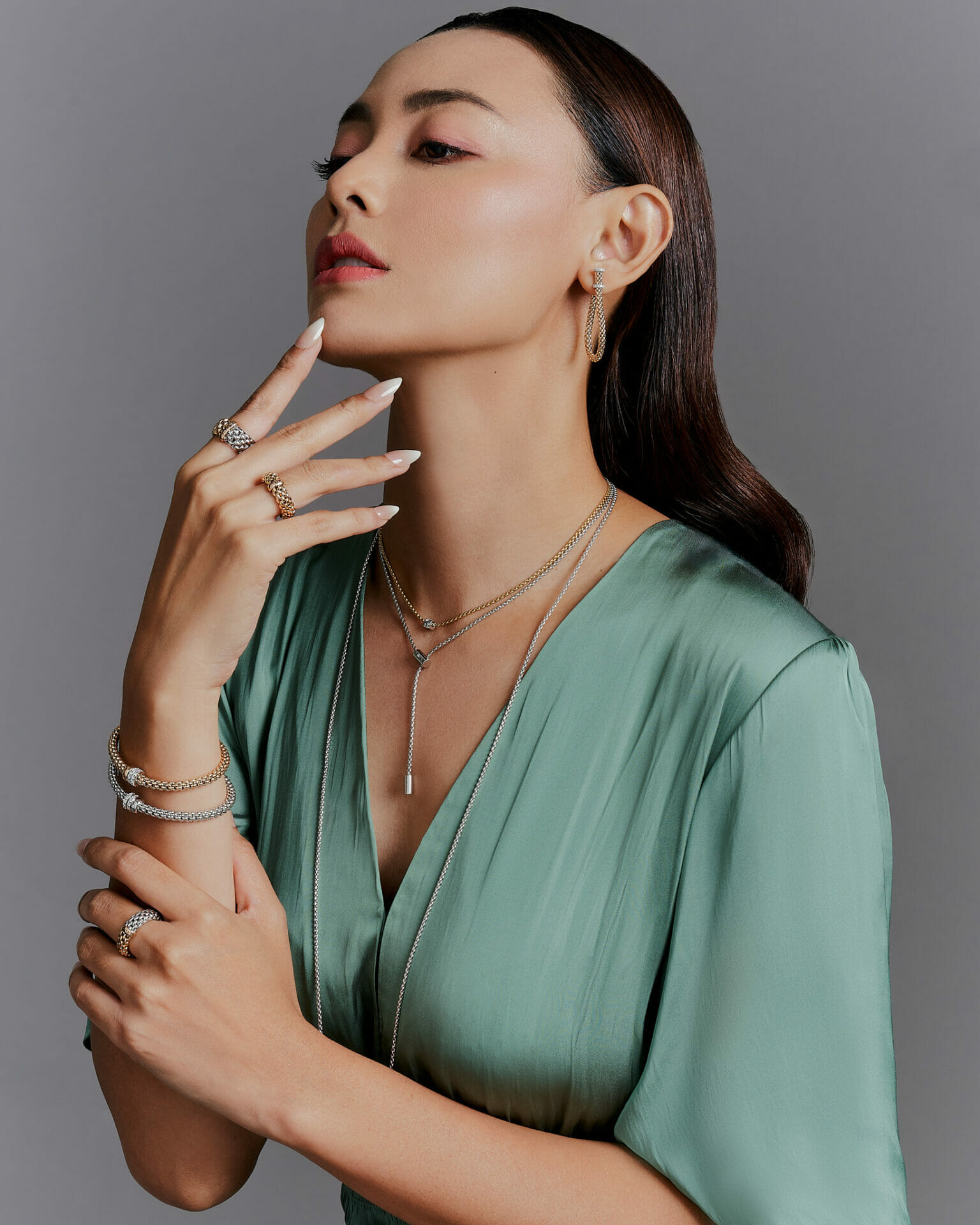 Whulandary menyarung The Solo Collection Flex’it bracelet with three rondels and diamond pavé, The Aria Collection Adjustable Lariat necklace, The Aria Collection long necklace with diamonds, The Aria Collection necklace with diamonds, The Essentials Collection bicolor Flex’it rings, The Essentials Collection Flex’it earrings with diamonds.