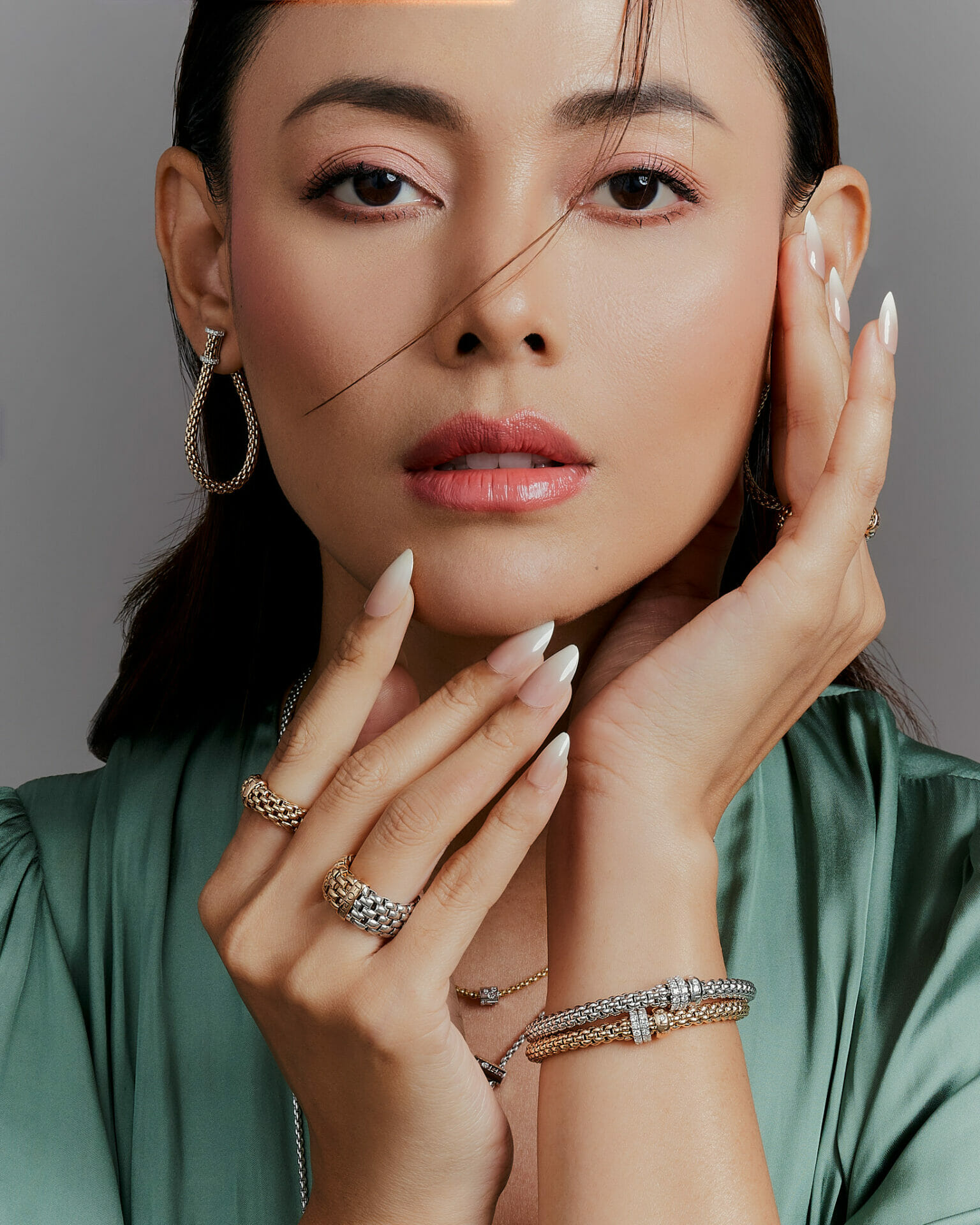 Whulandary menyarung The Souls Collection Flex’it rings, The Essentials Collection 18 karat gold hoops earrings, The Solo Collection Flex’it necklace with ornamental clasp and diamond pavé, The Solo Collection Flex’it bracelet with three rondels and diamond pavé, The Solo Collection Flex’it bracelet with three rondels and black diamond pavé, The Solo Collection Flex’it bracelet with double rondels and diamond pavé.
