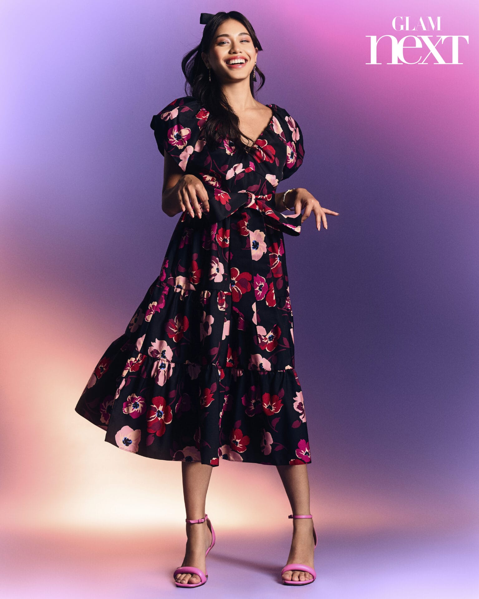 Manis Maya Letisha dalam gaun midi Fall Poppies, sepatu merah jambu Melrose Bonita, bangle dan anting-anting, Kate Spade