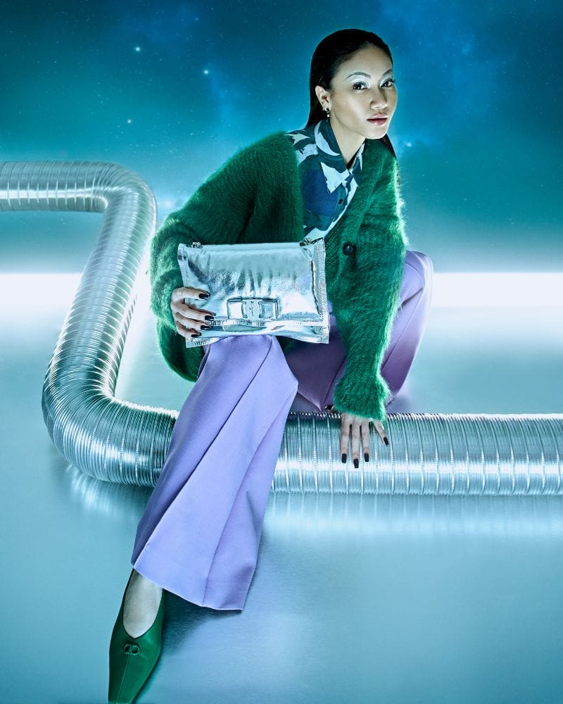 Kardigan labuh mohair menjadi kunci utama kepada gaya ini, warna hijau terang yang pantas menangkap mata. Dipadankan bersama kemeja bercorak dan celana potongan lebar. F Heel Pump Shoe dalam ton hijau dan imaginasi fesyennya disempurnakan dengan Viva Bow Bag dalam warna metalik perak.