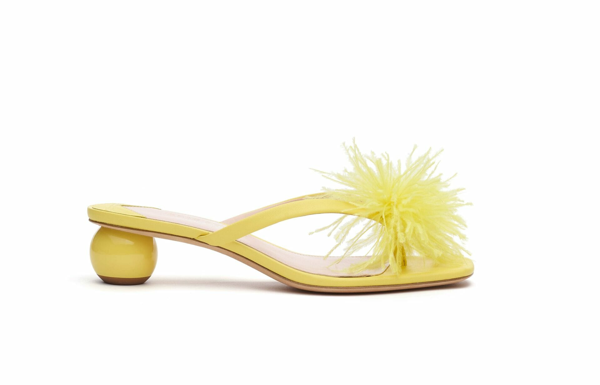 Sandal Bahama kreasi KATE SPADE NEW YORK diserlahkan dengan aksentuasi warna kuning dengan kombinasi bulu burung unta sebagai kreativiti terbaik. Ternyata bulu burung unta ditampilkan pada bahagian depan sandal sebagai aksi statement.
