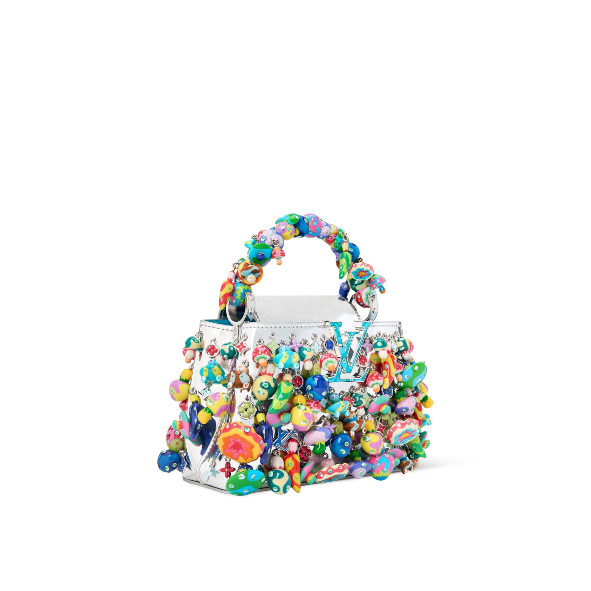 Antara highlight buat koleksi ini ialah Capucines EW Rainbow yang mengambil bentuk motif Rainbow Flower ikonik Murakami. Capucines Mini Mushroom pula menampilkan 100 watak cendawan psikedelik yang digilap dan disulam tangan pada kanvas cermin perak. Tidak ketinggalan, Capucines EW Dragon yang luar biasa, hasil penstrukturan semula beg yang belum pernah terjadi, mereproduksi karya monumental Murakami, lukisan Dragon in Clouds Indigo Blue sepanjang 18 meter.