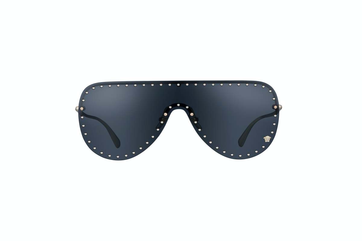 - Direka untuk meningkatkan gaya peribadi, bentuk ‘oversized’ dan kanta pelindung tanpa rim menawarkan ciri-ciri 3D light filled, kristal yang berwarna. Atau logam Medusa pada bahagian bawah kiri lensa, mengintepretasikan semula stail masa kini bersama muse Versace iaitu the Glam Medusa. Logo dan wajah 3D Medusa yang terpahat pada sisi kaca mata menyerlahkan lagi penampilan pabila menyarungnya. Hadir dalam warna emas dan lensa kelabu gelap.