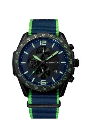 Peranti ini menggunakan kuasa pergerakan kronografi kuarza di dalam setiap steel case tahan karat yang didatangkan bersama kristal anti-pantulan tanpa menjejaskan permukaan jam. Sesuai digayakan ketika santai atau di mana sahaja, warna biru NATO dan hijau di sisi pada tali jam tangan menjadi daya tarikan pada si pemakai koleksi edisi terhad Alain Delon.