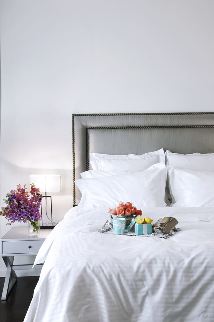 Kamar beradu utama, kekal berpaksikan palet neutral. Kepala katil berperincian studs ditempah khas dari Kokomo Interiors.