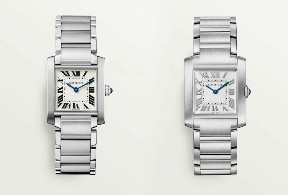 Versi Tank Française terdahulu di sebelah kiri dan tampil dengan crown juga paparan laman dail yang berbeza bagi model tahun 2023.