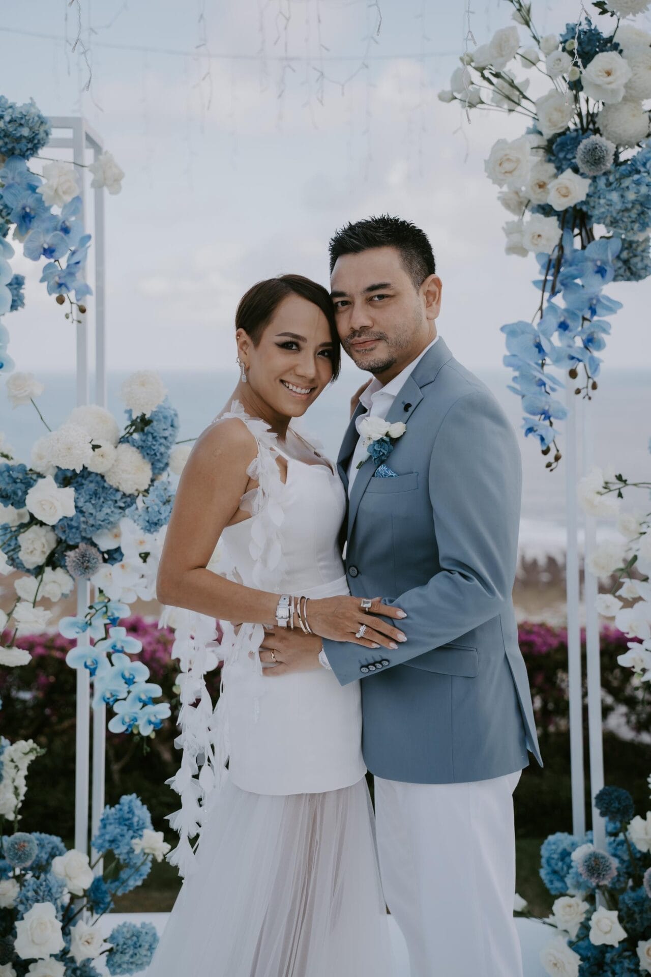 Rona biru menjadi tema perkahwinan Che Puan Jeslina untuk melengkapkan warna seakan langit dan air. “Kami memilih Karang Saujana Villas di Bali untuk destinasi perkahwinan kami kerana ia berdekatan dan juga keluarga Tungku Eddy mempunyai rumah di sana. Apa yang lebih istimewa, Bali ibarat rumah kedua bagi kami”. Semua tetamunya menerima kipas dan payung untuk membantu mereka kekal teduh dan sejuk