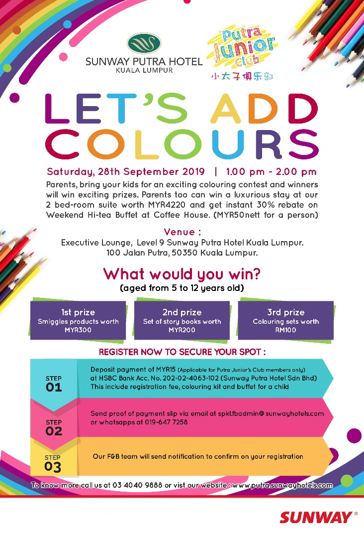 Sunway Putra Hotel baru-baru ini mengumumkan akan menganjurkan pertandingan mewarna ‘Lets Add Calours’ yang bakal diadakan 28 September ini, dari pukul 1 tengahari hingga 2 petang, yang bakal berlangsung di Executive Lounge, Level 9 di Sunway Putra Hotel.