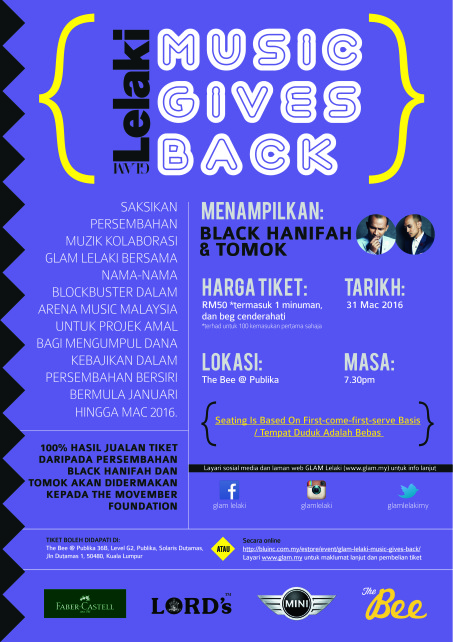 SAKSIKAN PERSEMBAHAN MUZIK KOLABORASI GLAM LELAKI BERSAMA NAMA-NAMA BLOCKBUSTER DALAM ARENA MUSIK MALAYSIA UNTUK PROJEK AMAL BAGI MENGUMPUL DANA KEBAJIKAN DALAM PERSEMBAHAN BERSIRI BERMULA JANUARI HINGGA MAC 2016.