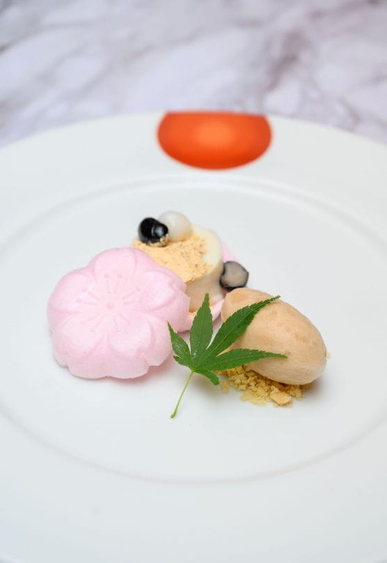 Soya Panna Cotta on Monaka & Monk Fruit Sorbet with Kinako, Mochi and Kuromame