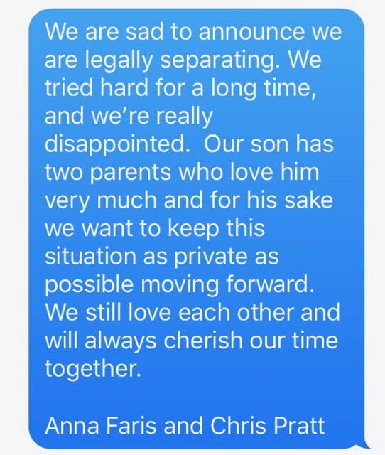 Sebelum ini Anna Faris mengumumkan perpisahannya menerusi Twitter. “Kami dukacita mengumumkan perpisahan kami secara rasmi. Anak kami memiliki dua ibu bapa yang menyanyanginya sepenuh hati dan demi kebaikannya kami mahu perpisahan ini berlaku secara peribadi pada masa akan datang. Kami saling mencintai di antara satu sama lain dan akan sentiasa menghargai saat-saat bersama.”