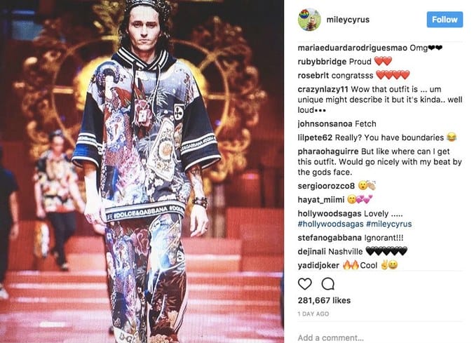 Namun Gabbana tidak berhenti disitu sahaja. Dia kemudiannya meninggalkan komen pada dua pos Cyrus.