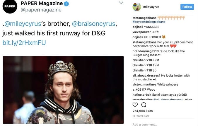 Sewaktu Minggu Fesyen Milan yang lalu, adik lelaki Miley Cyrus, Braison Cyrus, diberi peluang untuk memperagakan koleksi Spring 2018 Dolce & Gabbana dan sebagai seorang kakak yang bangga dengan pencapaian adiknya, Cyrus berkongsikan kegembiraannya di Instagram.